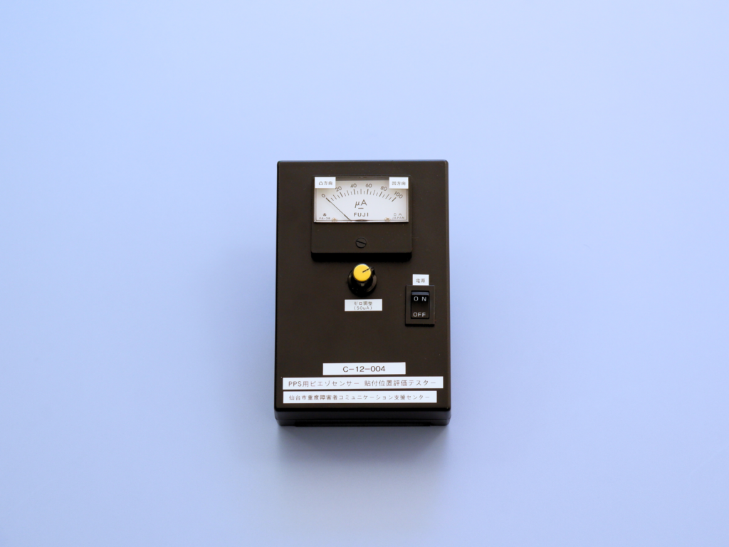 ピエゾセンサの貼付部位の動きに対する圧電素子の応答電圧をアナログメータに表示し、ある一定の力が加わった際の信号の強さをメータの針の振れ具合で表現するテスターを作製しました。