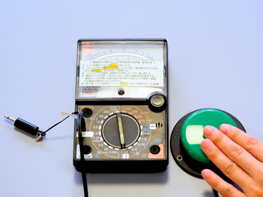接点式スイッチの断線や接触不良を確認するために、スイッチ操作時の接点の接触抵抗をアナログメータに表示する測定器を作製しました。 メータの針の振れ具合から、従来判断が難しかった経年劣化による接点不良も容易に判別することが可能となります。